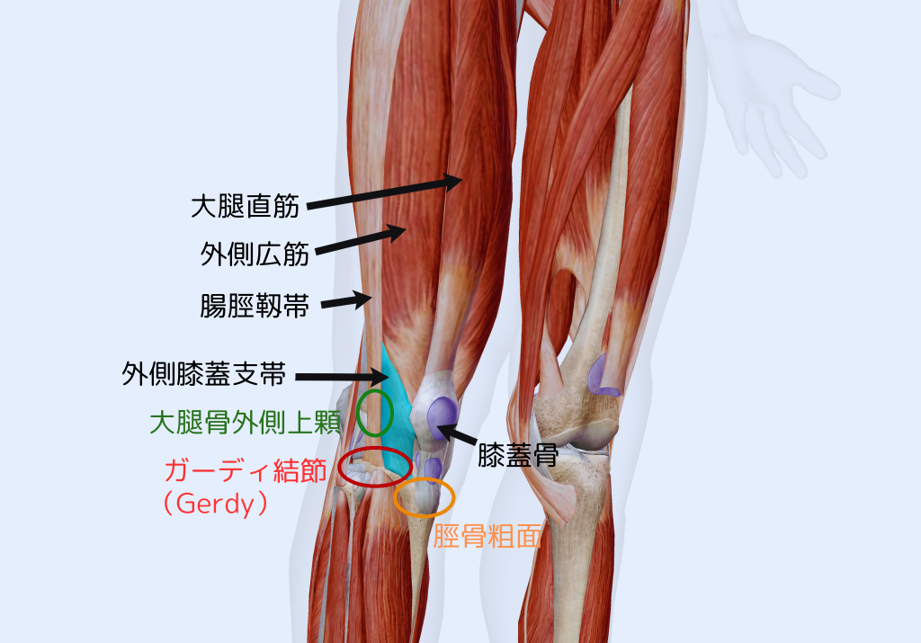 腸脛靭帯は大腿筋膜張筋、大殿筋(文献によっては中臀筋も)から起始し、浅層は膝蓋骨外側、中・深層は大腿骨外側上顆上を通って脛骨のガーディー結節に停止(付着)します。